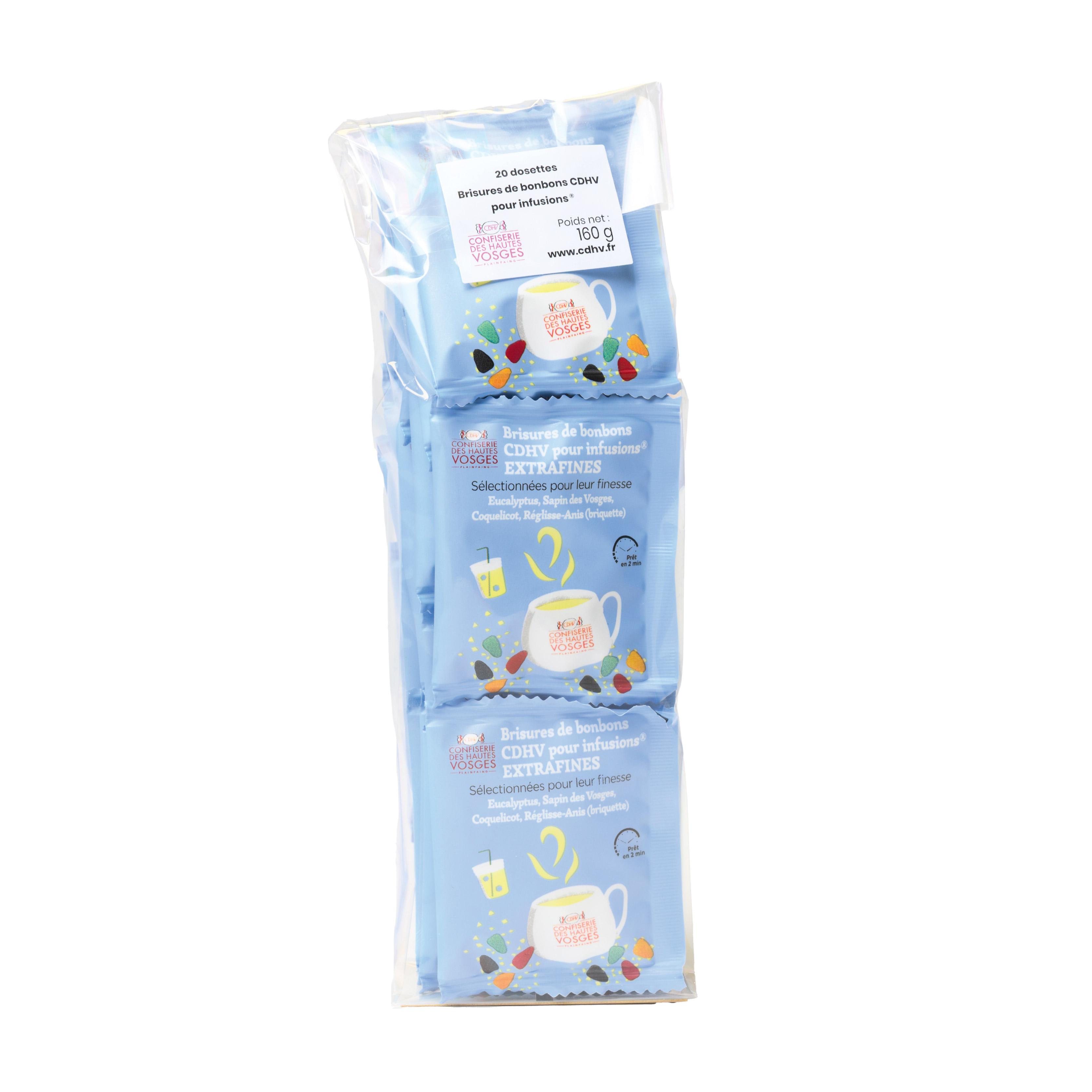 Brisures de bonbons CDHV pour infusions® à l’eucalyptus, au sapin des Vosges, à la bergamote, au miel, au parfums coquelicot, réglisse-anis (briquette).
